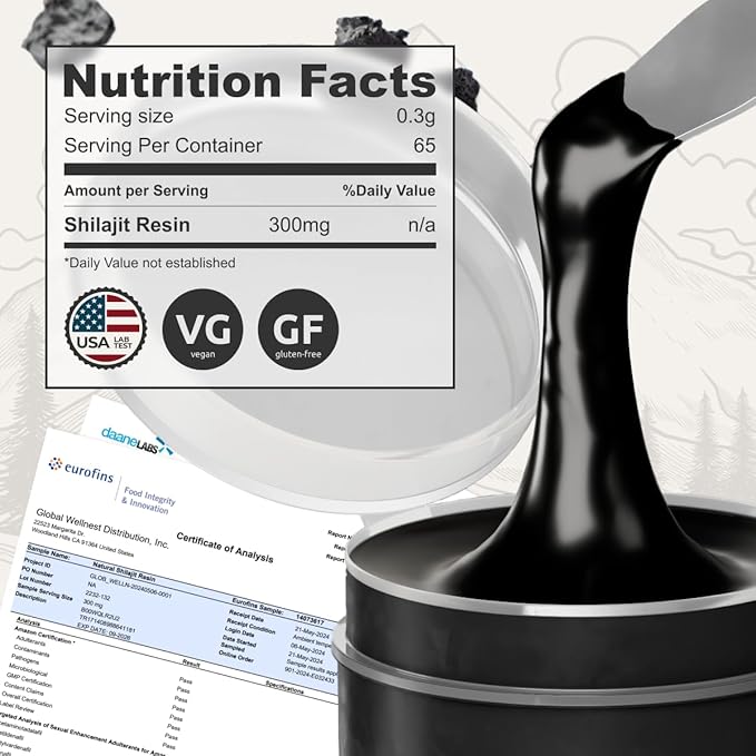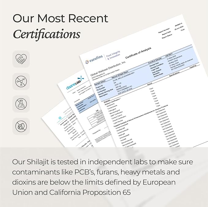 - LAB TESTED FOR SAFETY: Each new batch of shilajit supplement goes through vigorous testing to make sure contaminants like PCBs, furans, and dioxins are below the limits defined by European Union and California Proposition 65.