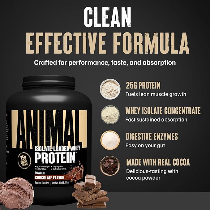 Animal Whey Isolate Protein Powder - Loaded for Pre & Post Workout Muscle Builder and Recovery with Digestive Enzymes for Men & Women - 25g Protein, Great Taste, Low Sugar - Chocolate 4 lbs