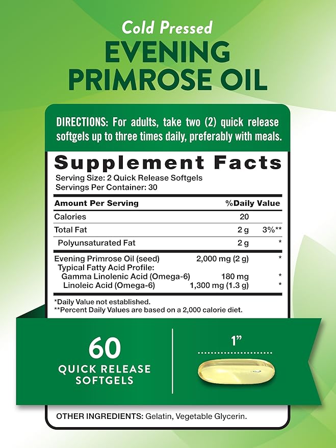 - COLD PRESSED FORMULA: 2,000 mg of Evening Primrose Oil per serving in quick release softgels