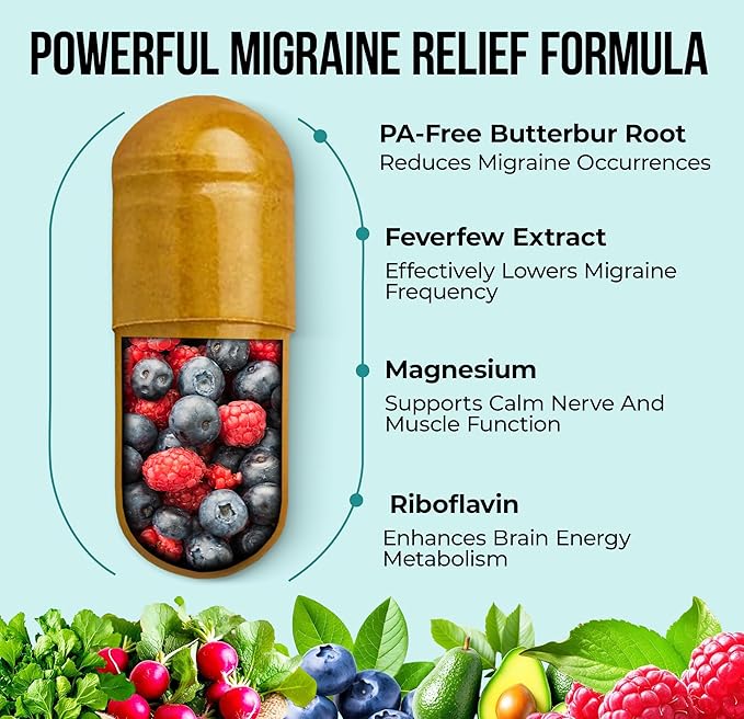 - Scientifically Backed Ingredients: Each butterbur for migraines capsule combines clinically studied nutrients known to support brain health and reduce migraine triggers for lasting headache relief