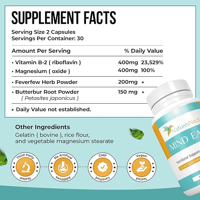 - High-Potency Relief for Migraines Formula: Contains extra strength riboflavin 400 mg per capsule—double the common dose—to target underlying nutritional deficiencies linked to migraines.