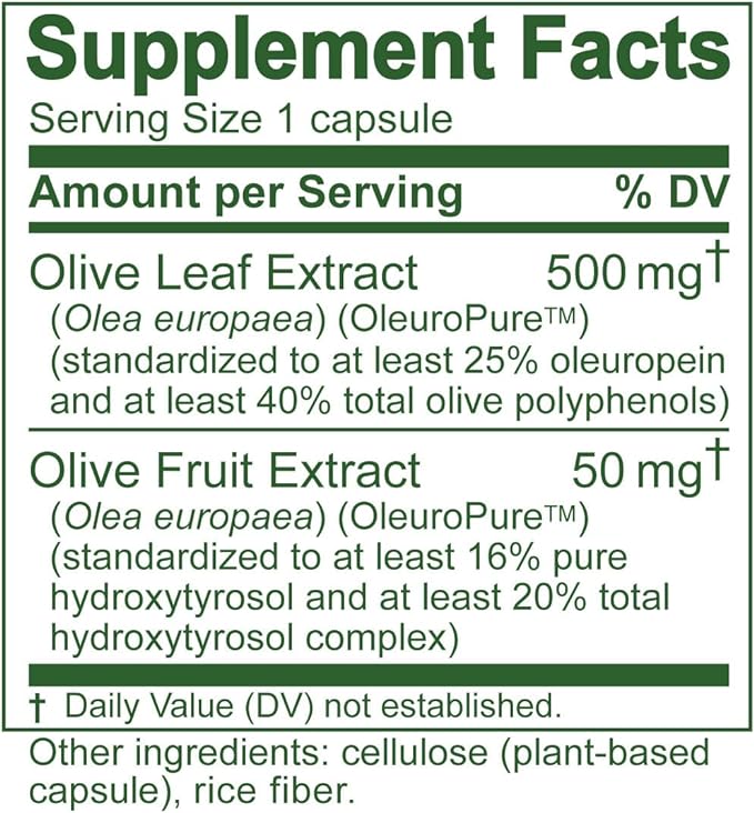 - 40% POLYPHENOLS — Super-strength 500mg Per Capsule (not “per serving”) of olive leaf extract. All 500mg is standardized to at least 25% pure oleuropein and 40% total olive polyphenols.