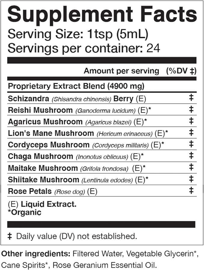 - Ingredients - Reishi (Ganoderma lucidum) Mushroom (E)*, Agaricus (Agaricus blazei) Mushroom (E)*, Lion's Mane (Hericum erinaceus) Mushroom (E)*, Cordyceps (Cordyceps militaris) Mushroom (E)*, Chaga (Inonotus oblicuus) Mushroom (E)*, Maitake (Grifola frondosa) Mushroom (E)*, Shiitake (Lentinula edodes) Mushroom (E)*, Schisandra (Schisandra chinensis) Berry (E)^, Rose (Rosa canina) Petals (E)^