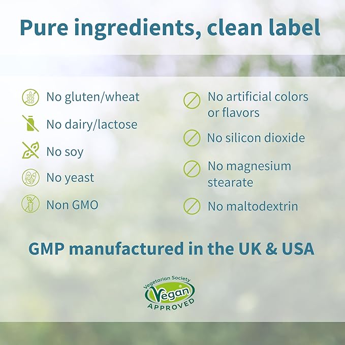 - PURE & CLEAN: vegan, non-GMO, hypoallergenic ingredients, no unpleasant fillers (silicon dioxide, magnesium stearate or titanium dioxide). Lab verified, USA & UK GMP manufactured. Small 9mm tablets