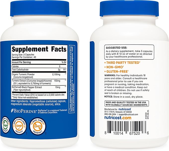 Nutricost Turmeric Curcumin with BioPerine and 95% Curcuminoids, 2300mg, 120 Capsules, Veggie Capsules, 767mg Per Cap, 40 Servings, Gluten Free, Non-GMO