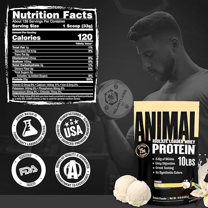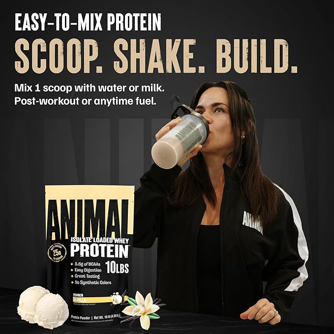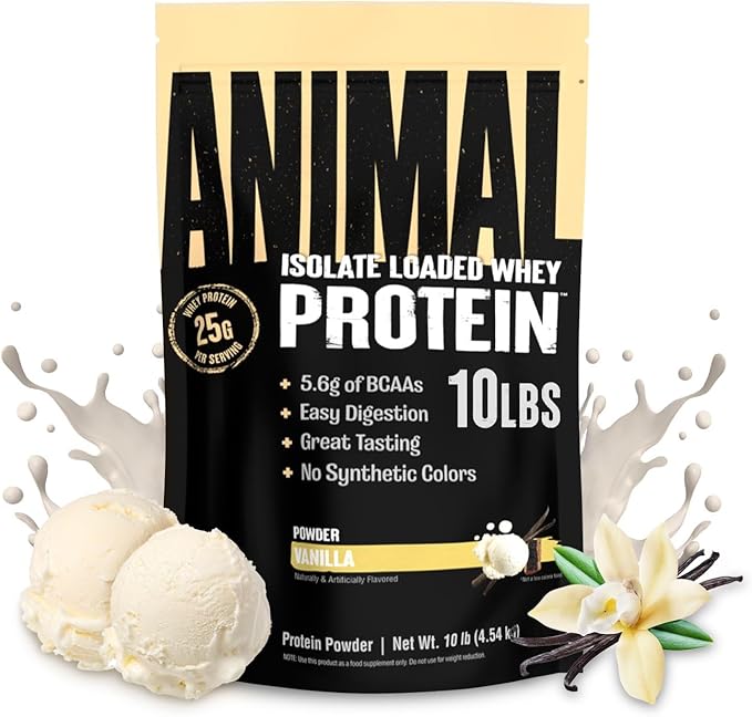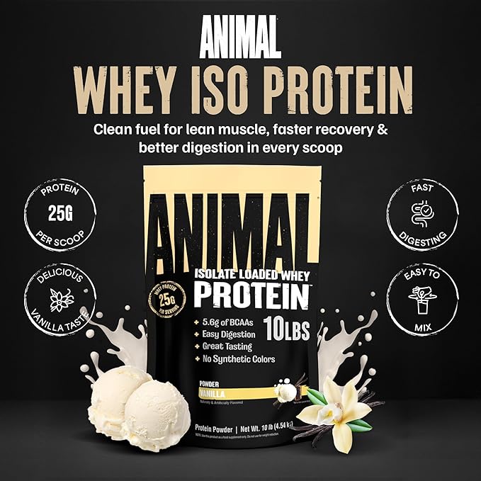 Animal Whey Isolate Protein Powder - Loaded for Pre & Post Workout Muscle Builder and Recovery with Digestive Enzymes for Men & Women - 25g Protein, Great Taste, Low Sugar - Vanilla 10 lbs