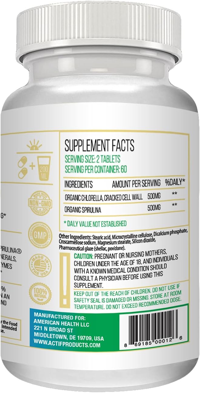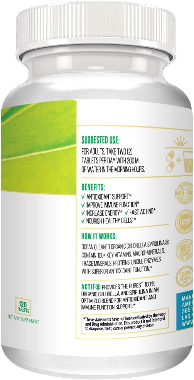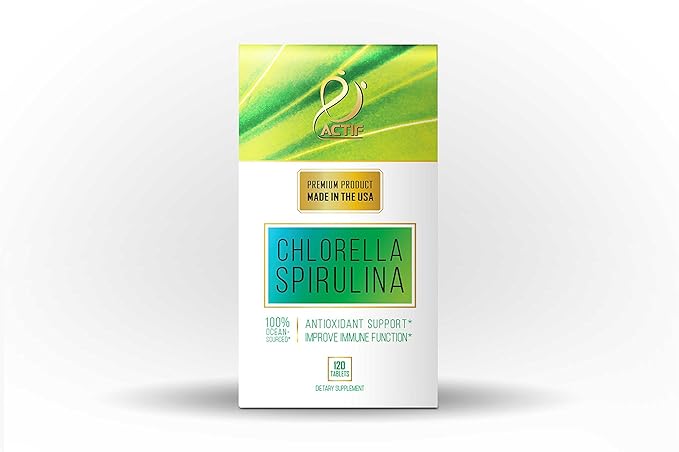ACTIF 100% Ocean Cleaned Organic Chlorella and Spirulina, Non-GMO, Best Detox and Vegan Diet Supplement, Made in USA - 120 Tablets