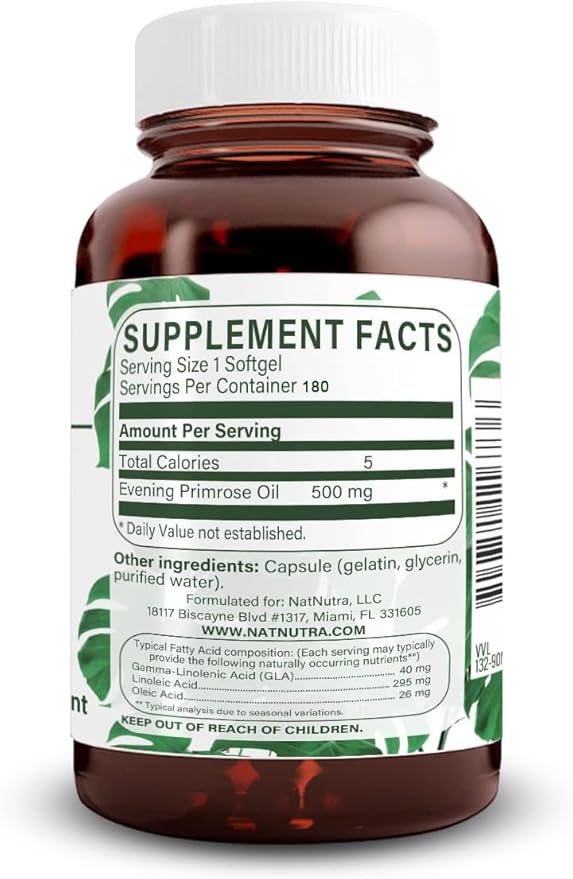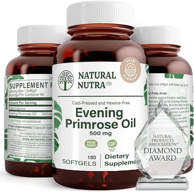 Natural Nutra Evening Primrose Oil Supplement from Fatty Acid, Helps Overcome Body Pain, Nerve Health, Promote Hearth Health & Skin Clarity, Helps Reduce Digestive Discomfort, 500 mg, 180 Softgel