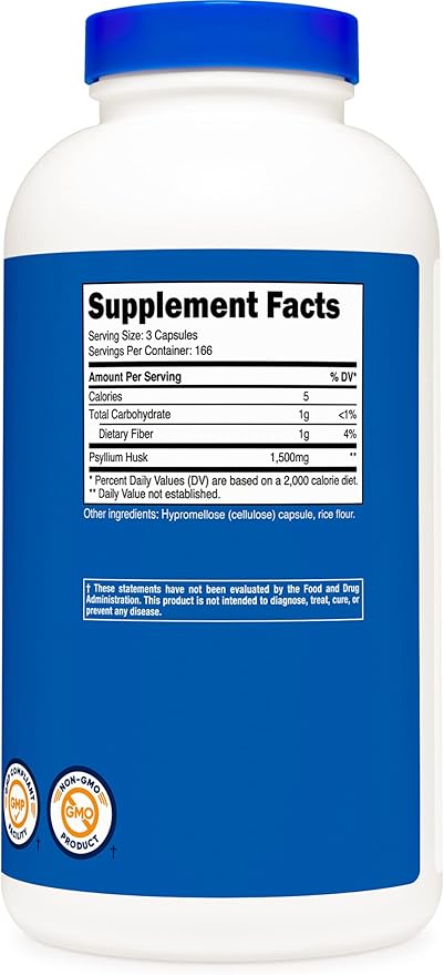 - 500mg of Psyllium Husk Per Capsule, 3 Capsules Per Serving