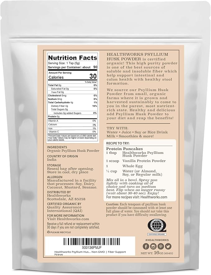 - HEALTHY ALTERNATIVE & COUNTLESS USES: Healthworks Psyllium Husk Powder is naturally gluten free and contains around 4g of fiber in each teaspoon. Goes great with water, juice, soy/rice milk, smoothies, breads, baked goods & more! Raw, Juicing, Vegan, Paleo, Keto, Clean Eating, Wellness, Active, Biohacking, Life Hacking, Yoga, Spiritual, Blending, Non-GMO, Plant Based.