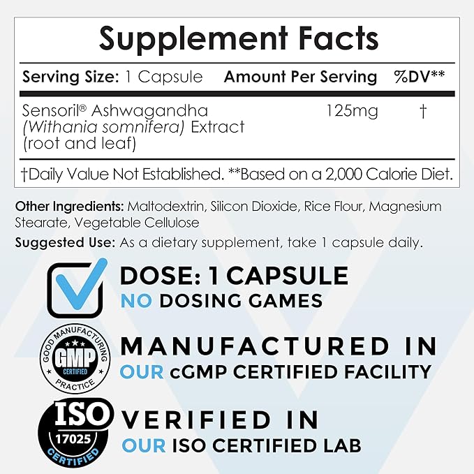 Nootropics Depot Sensoril Ashwagandha Capsules | 125mg | 90 Count | Ayurvedic Herb | Standardized Withania somnifera Extract