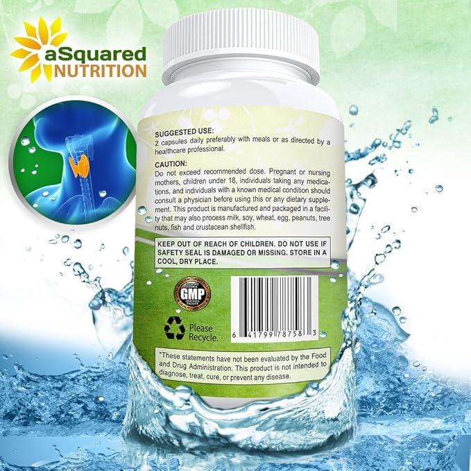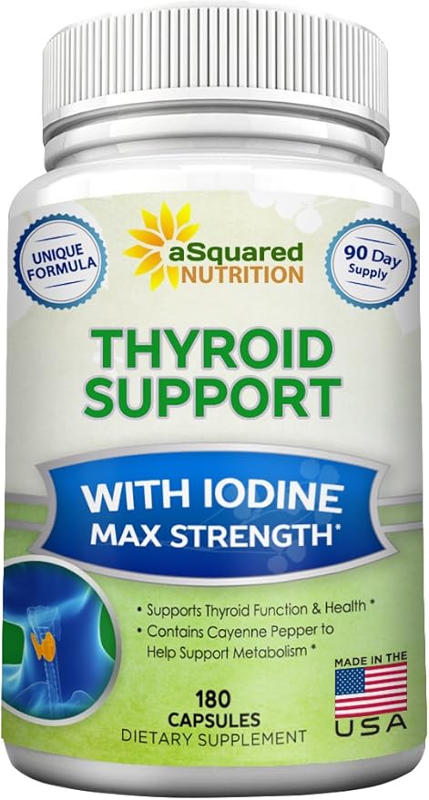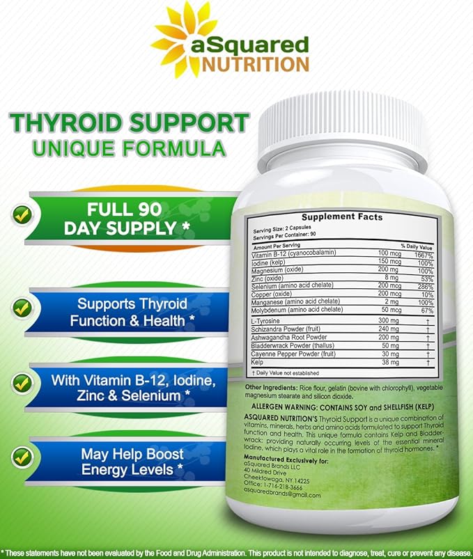 aSquared Nutrition Premium Thyroid Support Supplement with Iodine (180 Capsules) - Best Herbal & Vitamin Complex Pills w/ B12, Ashwagandha, Bladderwrack & Kelp - Helper for Healthy Hormone & Energy