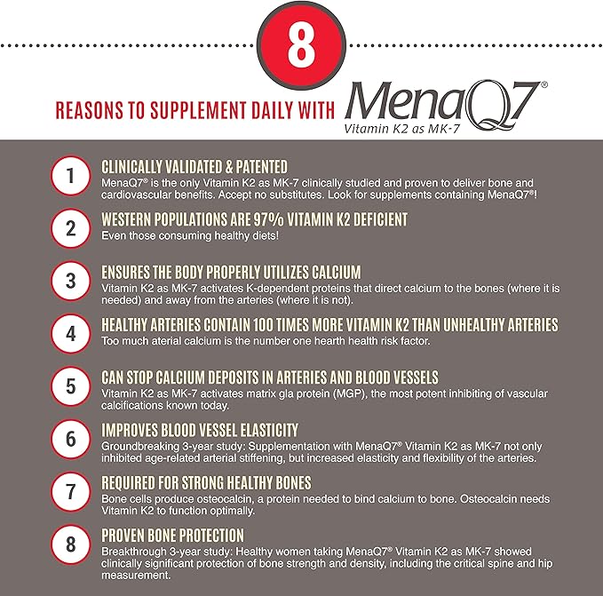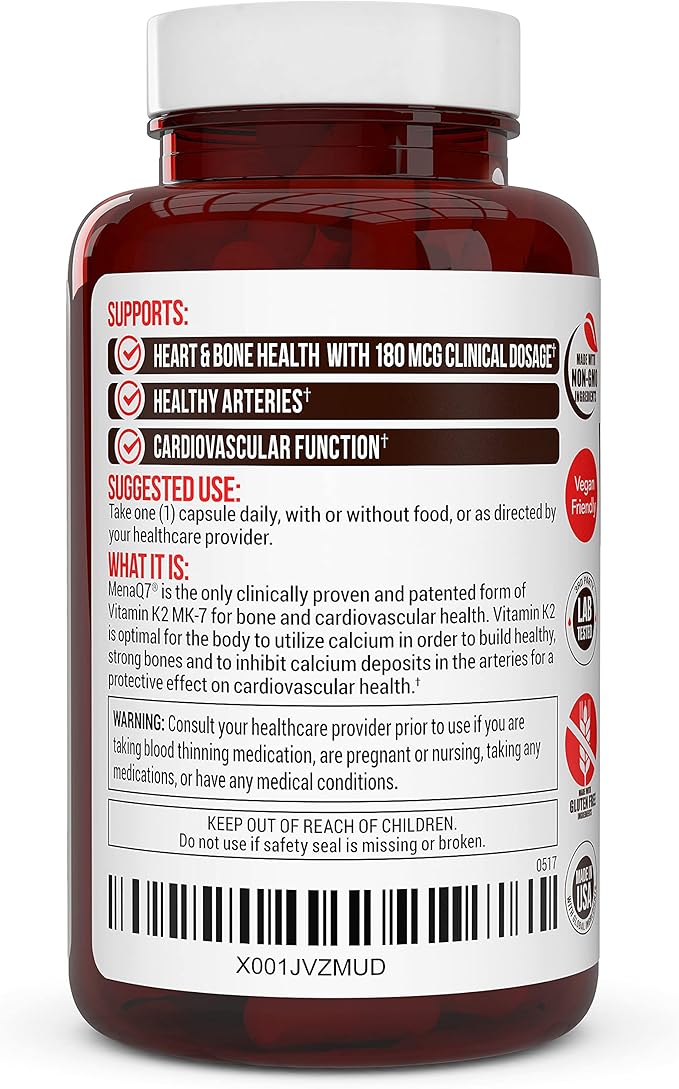 - 180 MCG MENAQ7 - MenaQ7 is a patented form of Vitamin K2 (MK-7) for bone and cardiovascular health. Our clinical dosage of MenaQ7 is stronger than the dosage in many Vitamin K2 supplements, and it is the only clinically proven dosage associated with improved bone and heart health. Consult your healthcare provider prior to use if you are taking blood thinning medication, pregnant, nursing, taking any medication or have any medical conditions.
