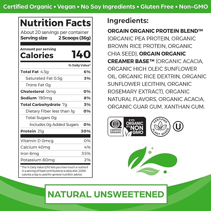 Orgain Organic Unflavored Vegan Protein Powder, Natural Unsweetened - 21g of Plant Based Protein, Non Dairy, Gluten Free, No Sugar Added, Soy Free, Non-GMO, 1.59 lb (Packaging May Vary)