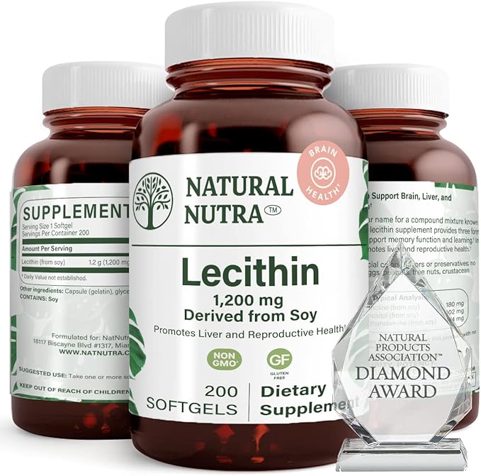 Natural Nutra Soy Lecithin 1200 mg Dietary Supplement - Brain Function, Liver Health, Improve Procreant Health, Boosting Supplement - Gluten-Free, BPA-Free, 200 Softgels in Recyclable Glass Bottles