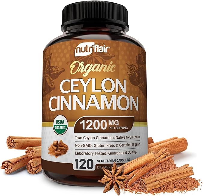 NutriFlair Organic Ceylon Cinnamon Supplement 1200mg, 120 Capsules - USDA Certified - Non-GMO, Gluten Free Powder, Antioxidant Pills