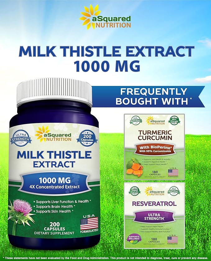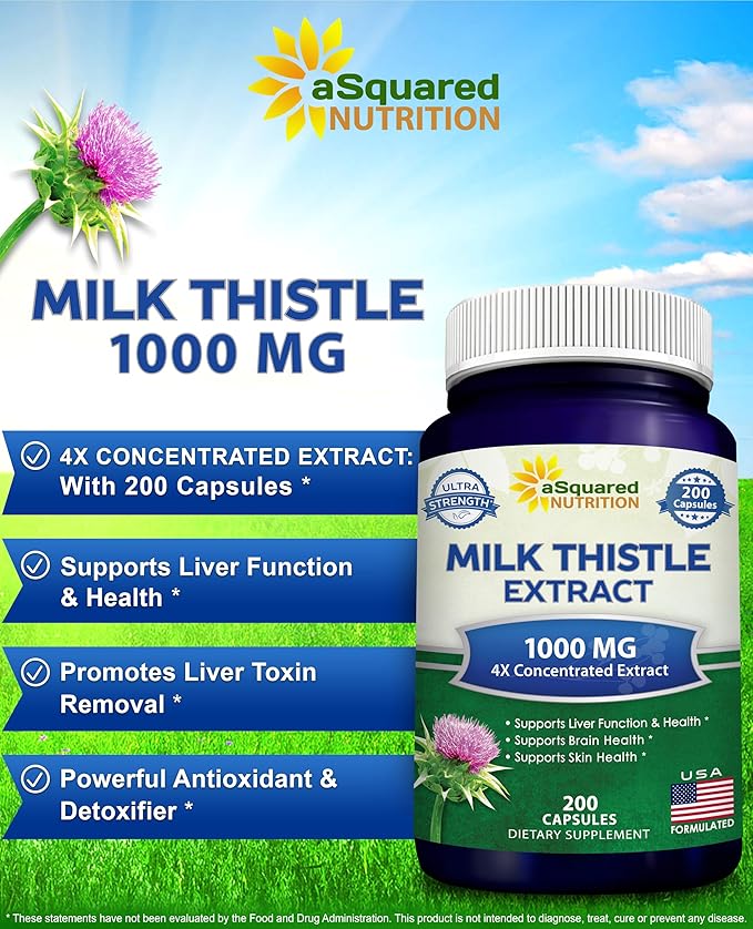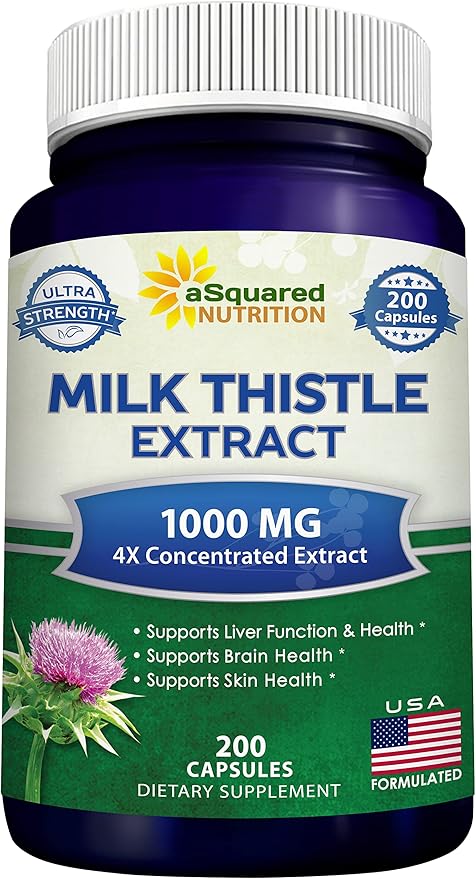 aSquared Nutrition Milk Thistle Supplement 1000mg-200 Capsules,Max Strength 4X Concentrated Extract 4:1 Milk Thistle Seed Powder Herb Pills, 1000 mg Silymarin Extract for Liver Support, Cleanse, Detox