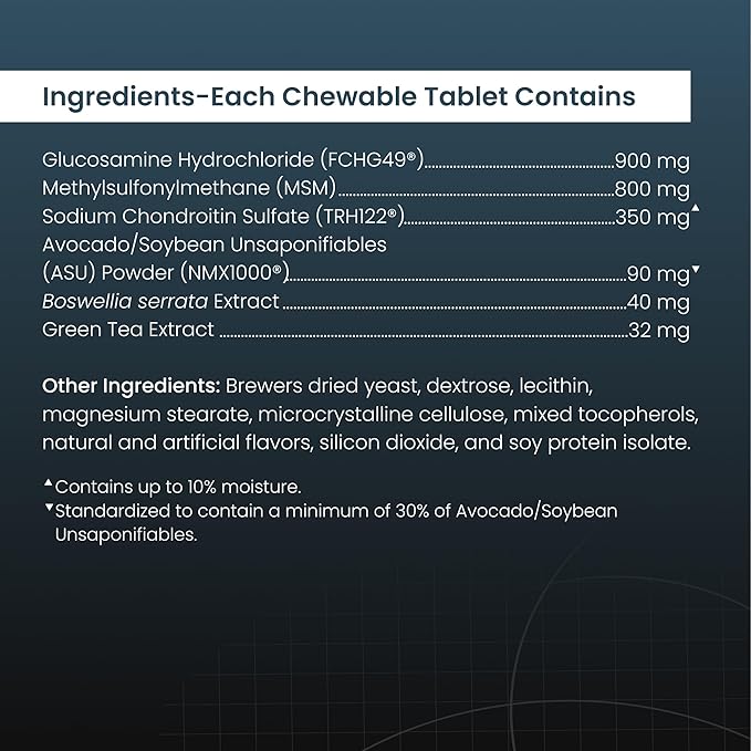 - Patented Formula - With a unique combination that contains glucosamine hydrochloride (FCHG49), sodium chondroitin sulfate (TRH122), ASU (NMX1000), methylsulfonylmethane (MSM), Boswellia serrata extract, and green tea extract, Dasuquin helps support your dog’s joint health.