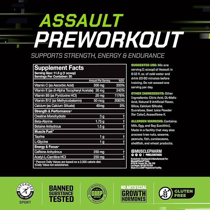 - Explosive Energy & Strength: MusclePharm Assault Sport Pre Workout Powder is engineered for those who seek an edge in their workout regimen. Packed with potent ingredients like Beta Alanine, Caffeine, Creatine and more, it’s the ultimate pre workout for enhanced endurance and reduced muscle fatigue.