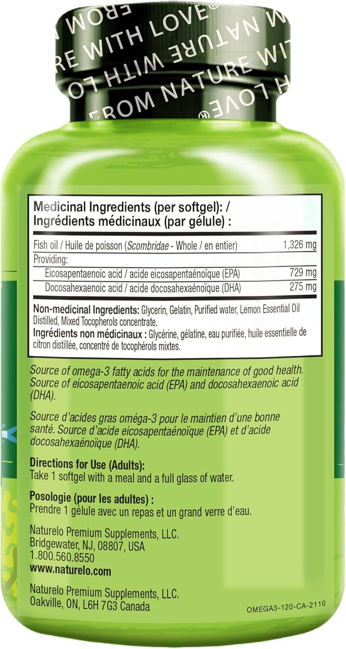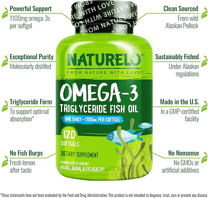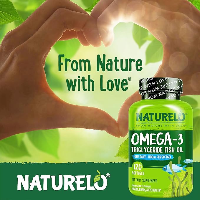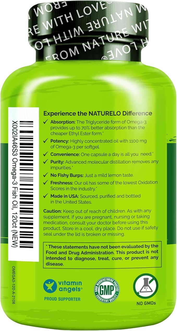 NATURELO Burpless Omega 3 Fish Oil Supplement - 1100mg Triglyceride Omega-3, EPA + DHA, Liquid Fish Oil for Heart, Eye, Brain, Joint Health - 120 Softgels, 4 Months Supply