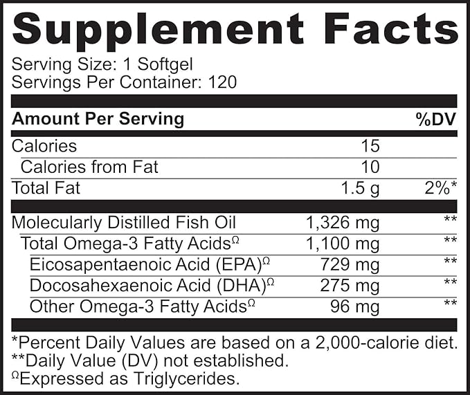 - HIGH ABSORPTION: The fish oil omega 3 supplements use the Triglyceride form of Omega-3 to support absorption. Each softgel packs a potent 1100 mg of Omega-3, requiring only one capsule per day to help meet your omega-3 DHA and EPA fatty acid needs.
