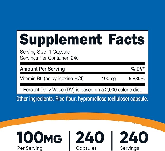 - 100mg of Vitamin B6 (Pyridoxine HCl) per Capsule