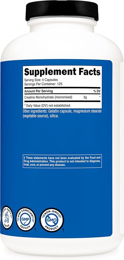 - 500 Capsules (125 Servings) of Creatine Monohydrate Per Bottle