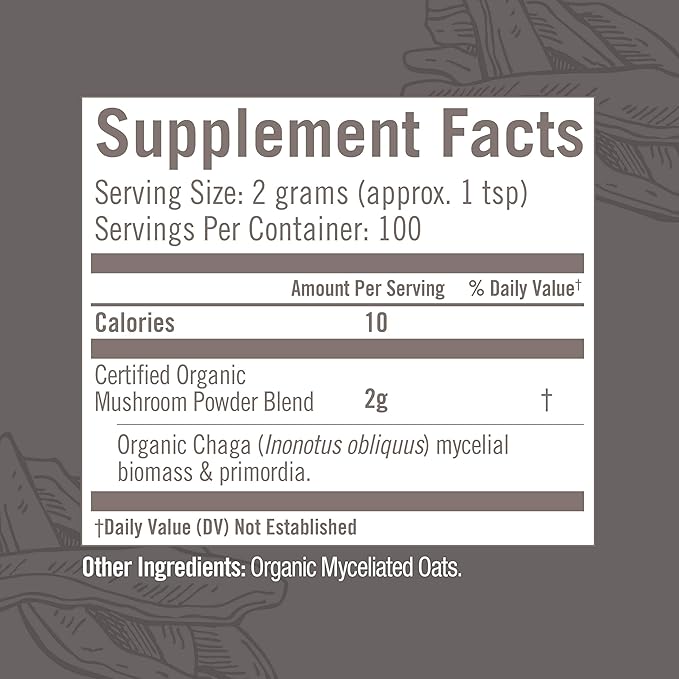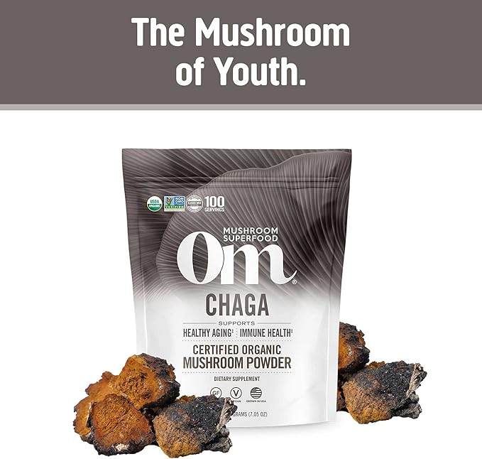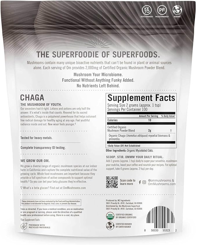 - Contains - 1 jar (200g) of Om Organic Chaga Mushroom Powder Superfood Supplement, each serving provides an efficacious dose of 2,000mg of functional mushrooms. Also available in Om mushroom capsules