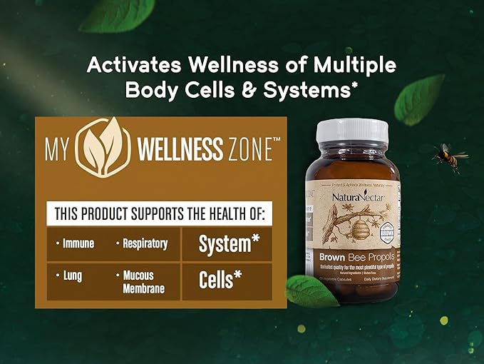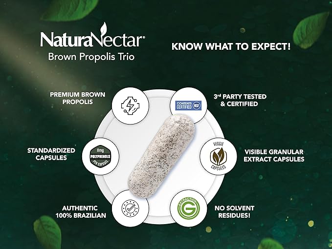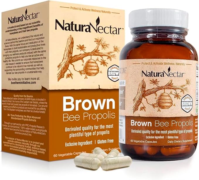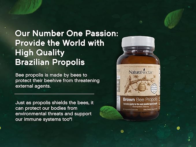 - ORGANIC AROMATIC ACIDS & FLAVONOIDS: NaturaNectar Brown Bee Propolis combines the purest organic aromatic acids and flavonoids to support your body's natural defenses. Just as bee propolis protects the hive, these propolis capsules shield you from environmental threats while bolstering your immune system. Made with Brazilian propolis, this propolis supplement is naturally sourced, ethical, and ideal for maintaining health. Choose propolis capsules for trusted, nature-inspired wellness.