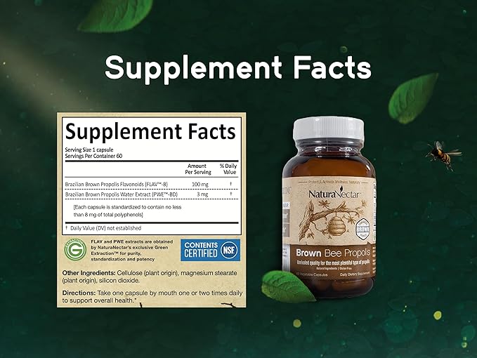- NSF CONTENTS CERTIFIED: NaturaNectar Brown Bee Propolis is the first and so far only Brazilian brown propolis supplement certified to the NSF/ANSI 173 standard for dietary supplements. Feel confident knowing this exclusive propolis capsule is gluten-free and free from ethanol, propylene glycol, or harsh chemicals. Made with ethically sourced brown propolis, these propolis capsules are solvent-free, verified by NSF International, and provide the highest quality for natural health and wellness.