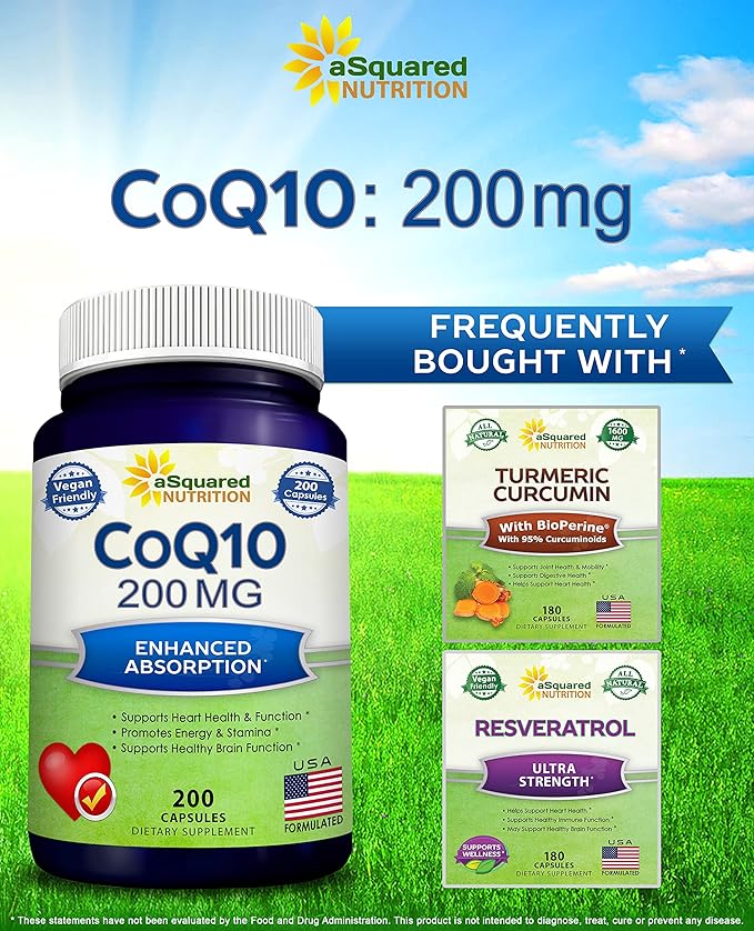 aSquared Nutrition CoQ10 (200 Capsules and 200mg) - High Absorption Vegan CO Q-10 Powder - Enzyme Ubiquinone Supplement Pills, Extra Antioxidant Coenzyme Q10 Vitamin, Coq 10 Alernative to Softgels