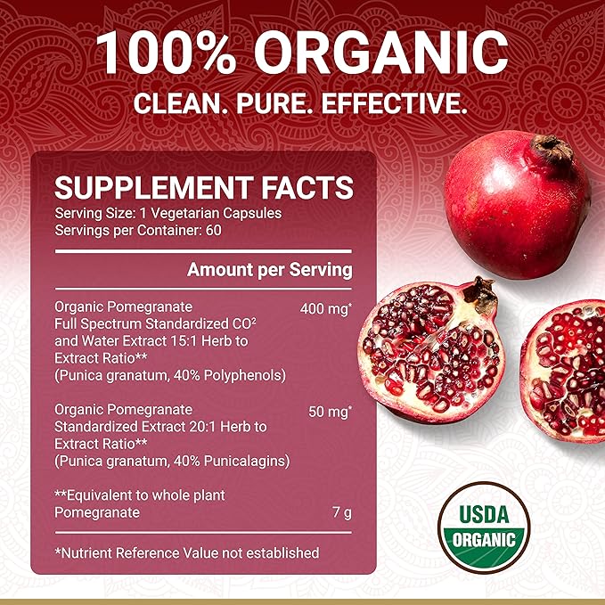 - THE ONLY USDA ORGANIC CERTIFIED POMEGRANATE: A higher regulatory standard that guarantees a high quality & natural supplement you can trust. Not many brands have the USDA Organic badge and this proves the investments True Veda makes to have an organic verifiable supplement. Our plant-based capsules only contain Organic Pomegranate and nothing else - True Veda 100% organic without compromise!