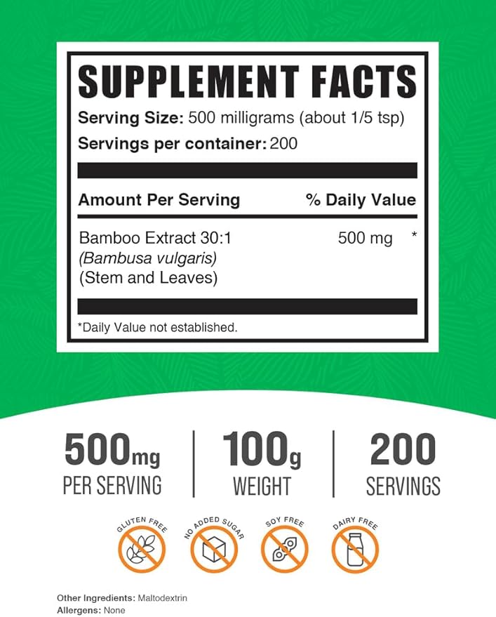 BulkSupplements.com Bamboo Extract Powder - Silica Supplements, Bamboo Supplement - Herbal & Gluten Free, 500mg per Serving, 100g (3.5 oz) (Pack of 1)