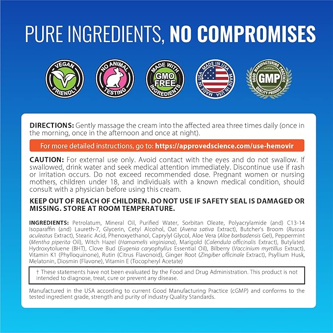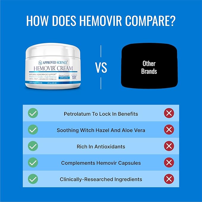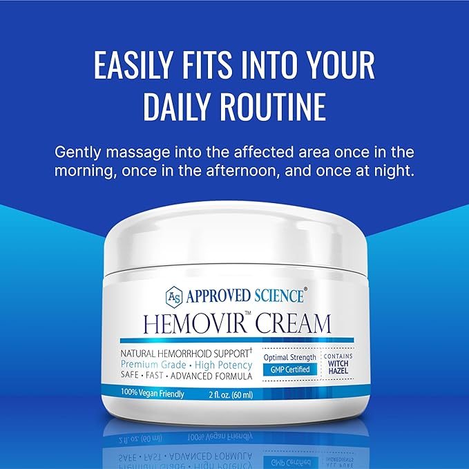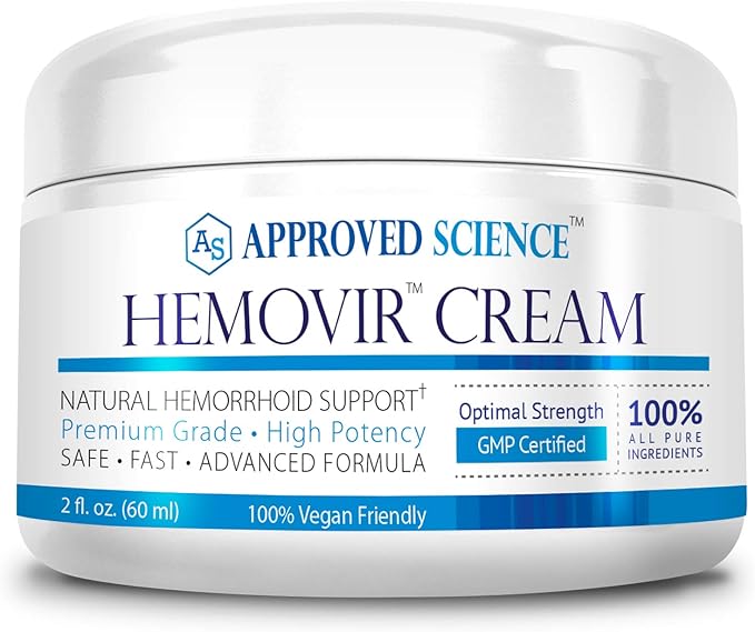 Approved Science Hemovir Cream - Hemorrhoid Support - 2 Fl Oz - Stops Itching and Optimizes Blood Flow - Restores Damaged Skin Tissue - Non GMO - Made in The USA