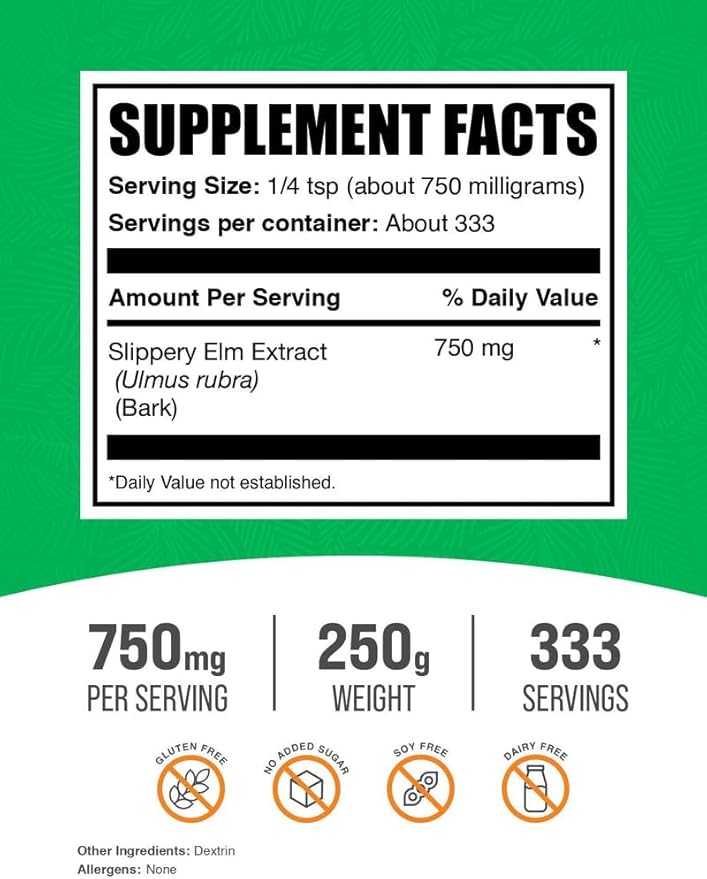BulkSupplements.com Slippery Elm Bark Extract Powder - Slippery Elm Powder, Sourced from Ulmus Rubra Bark - Gluten Free, 750mg per Serving, 250g (8.8 oz) (Pack of 1)