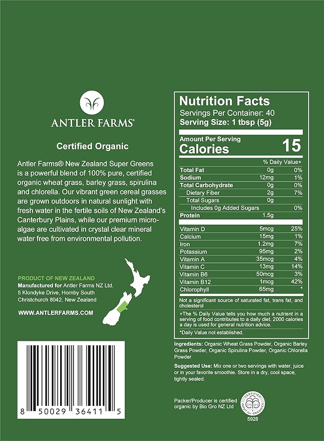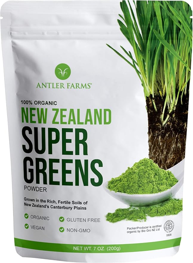 Antler Farms - 100% Pure Organic New Zealand Super Greens Powder, 40 Servings, 200g - Wheat Grass, Barley Grass, Chlorella, Spirulina - Vegan, Gluten Free, Chlorophyll Rich, for Energy and Detox