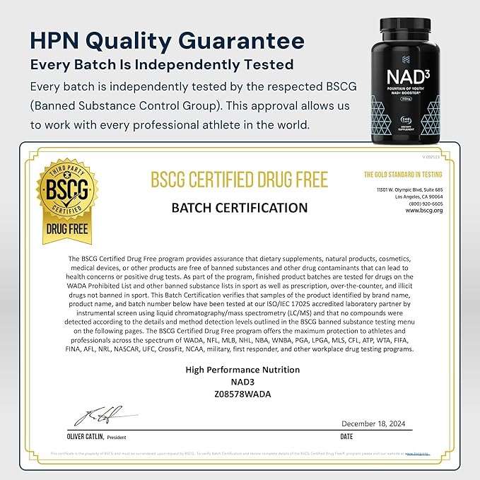 - INDEPENDENTLY TESTED BY THE BSCG - NAD(3) is made in the USA with NSF cGMP certified manufacturing and independently tested for guaranteed purity and quality with every bottle