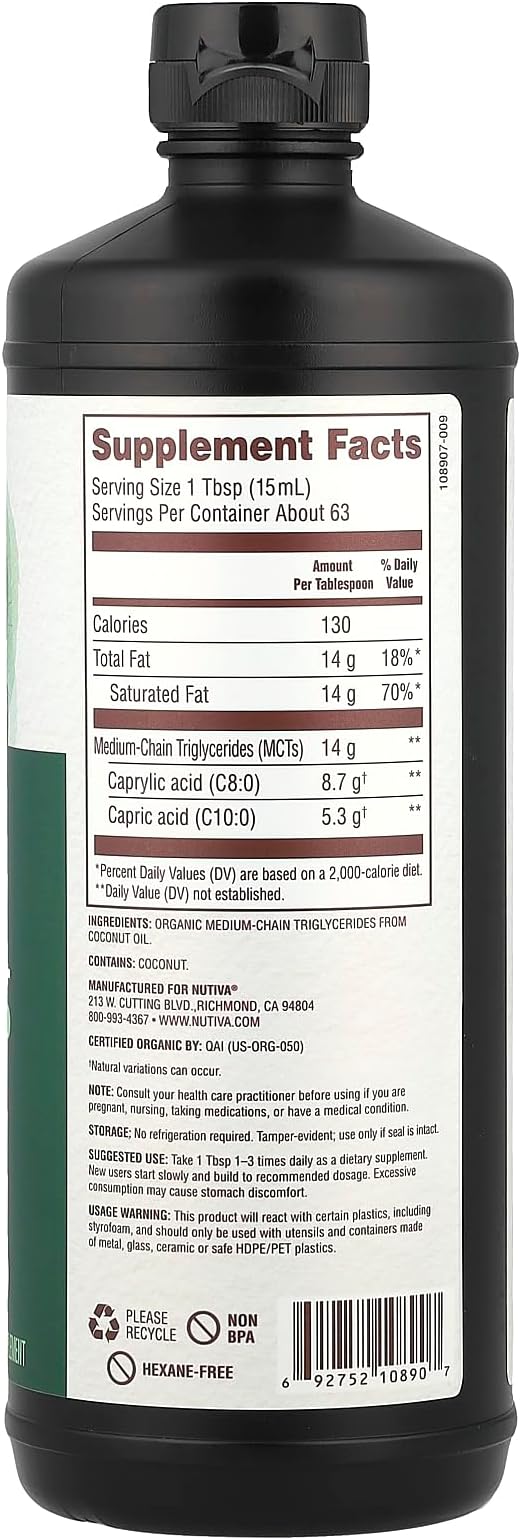 Nutiva Organic MCT Oil, Unflavored, 32 Oz, USDA Organic, Non-GMO, Non-BPA, Whole 30 Approved, Vegan, Gluten-Free & Keto, 14g MCT per Serving & Neutral Flavor for Energy Boost to Coffee, Shakes and Salads