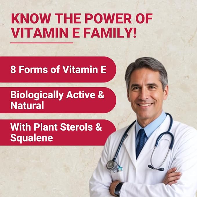 - ✅ COMPLETE 8 FORMS of VITAMIN E IN 1 SOFTGEL! — This is not your ordinary Vitamin E Supplement. This supplement contains all 8 forms of vitamin E (four tocopherols and four tocotrienols—with squalenes and beta‒sitosterols) each share some similar functions while also possessing distinct roles that your body needs.