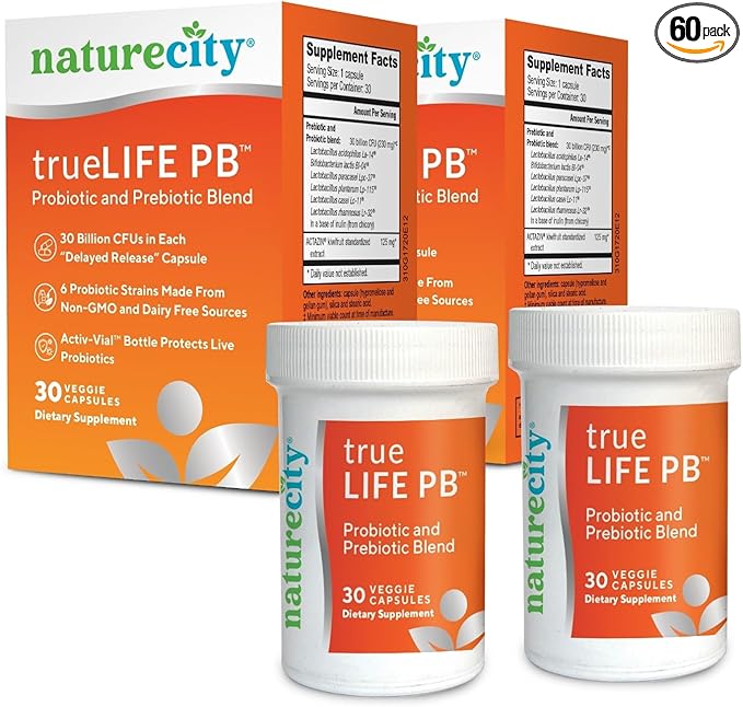 NatureCity True-Life-PB Shelf Stable Blend Prebiotics and Probiotics for Women and Men - Digestive Gut Health Supplements for Women and Men - Dairy Free - (60 Veggie Capsules)