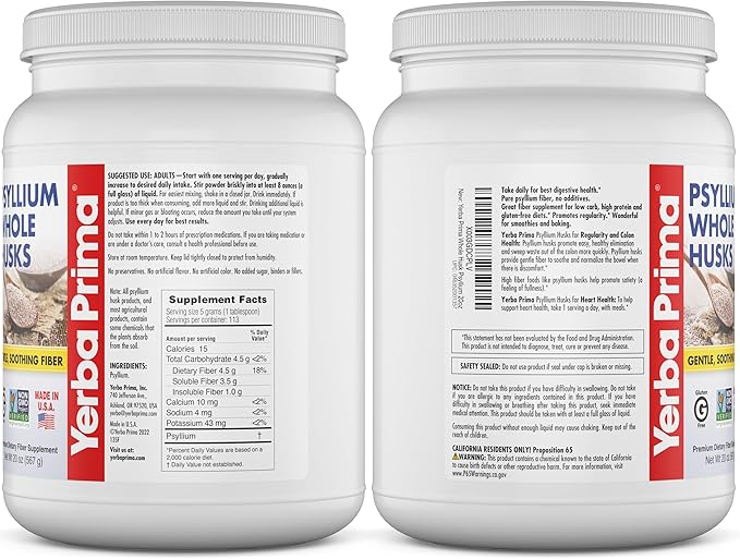 - ALL NATURAL DIETARY FIBER: Yerba Prima Psyllium Whole Husks is Gluten Free, Non GMO, with no added sugars, artificial flavors, artificial colors, binders or fillers. Add the husks to water, orange juice, smoothies, cereals and baked goods.