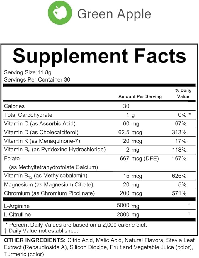 - PACKED WITH ESSENTIAL NUTRIENTS – Contains L-Arginine, L-Citrulline, Vitamin C, Vitamin D, Vitamin K, Magnesium, Chromium, Citric Acid, Stevia, and more to support overall health.