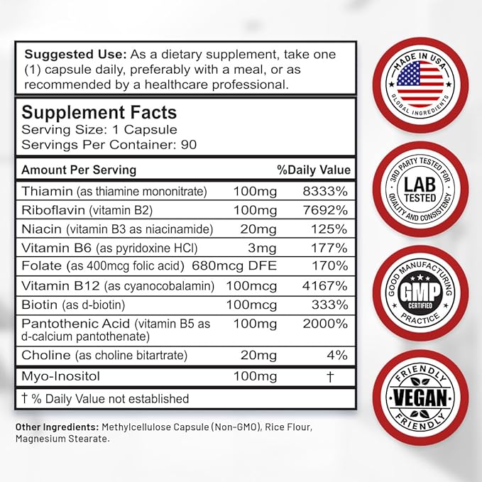- Highest Quality Ingredients - Our formula is made up of only pure ingredients with no harmful additives. Simply the full B-Complex plus the combo of Inositol and Choline, two naturally occurring close cousins to the B Vitamin family. Our capsules are non GMO, soy free, gluten free and have no preservatives, silicone dioxide or artificial ingredients.