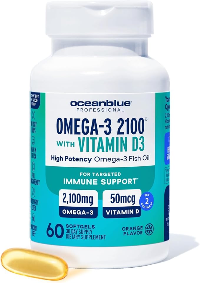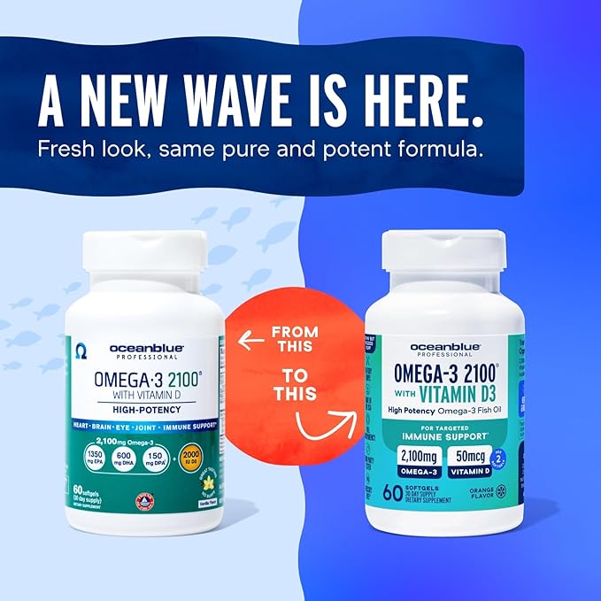 - 2-IN-1 OMEGA-3 SUPPLEMENT: OceanBlue Omega-3 2100 with Vitamin D3 combines our triple-strength Omega-3 fish oil with 2,000 IU of Vitamin D3 to help support a healthier body and simplify your daily wellness routine with fewer capsules