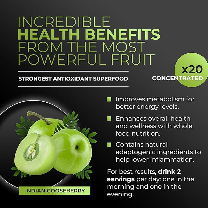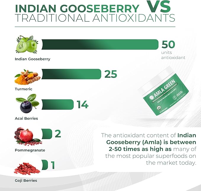 - THE ORIGINAL 20X CONCENTRATED AMLA SUPPLEMENT: Amla Green is your daily tea powder supplement delivering unmatched antioxidative support through 20x concentrated amla with an ORAC Value of 261,500, which is 75 times higher than goji berries. Supported by published research, including clinical trials, amla has shown positive results for youthful benefits and critical areas of vitality and health.