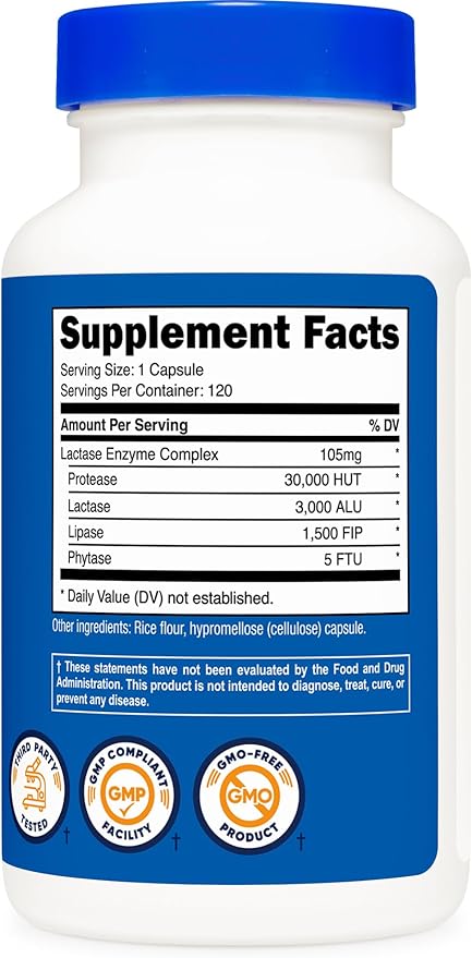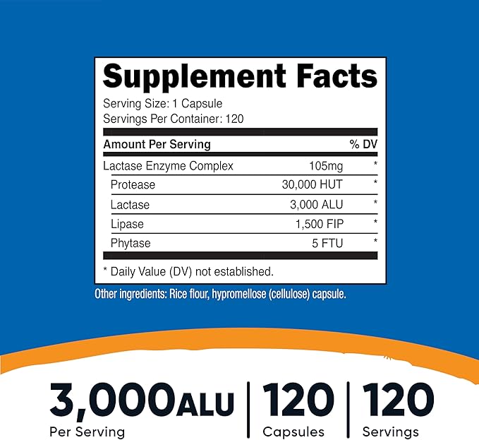 Nutricost Lactase Enzyme Complex 3,000 FCC ALU, 120 Vegetarian Capsules - Non-GMO, Gluten Free, 120 Servings