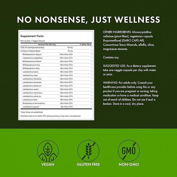 - POWERFUL FORMULA: Our natural digestive supplement features 16 strains of probiotic almost 4x the strains of other popular formulations with 3.5 billion CFUs per capsule, supporting comprehensive probiotic nourishment.