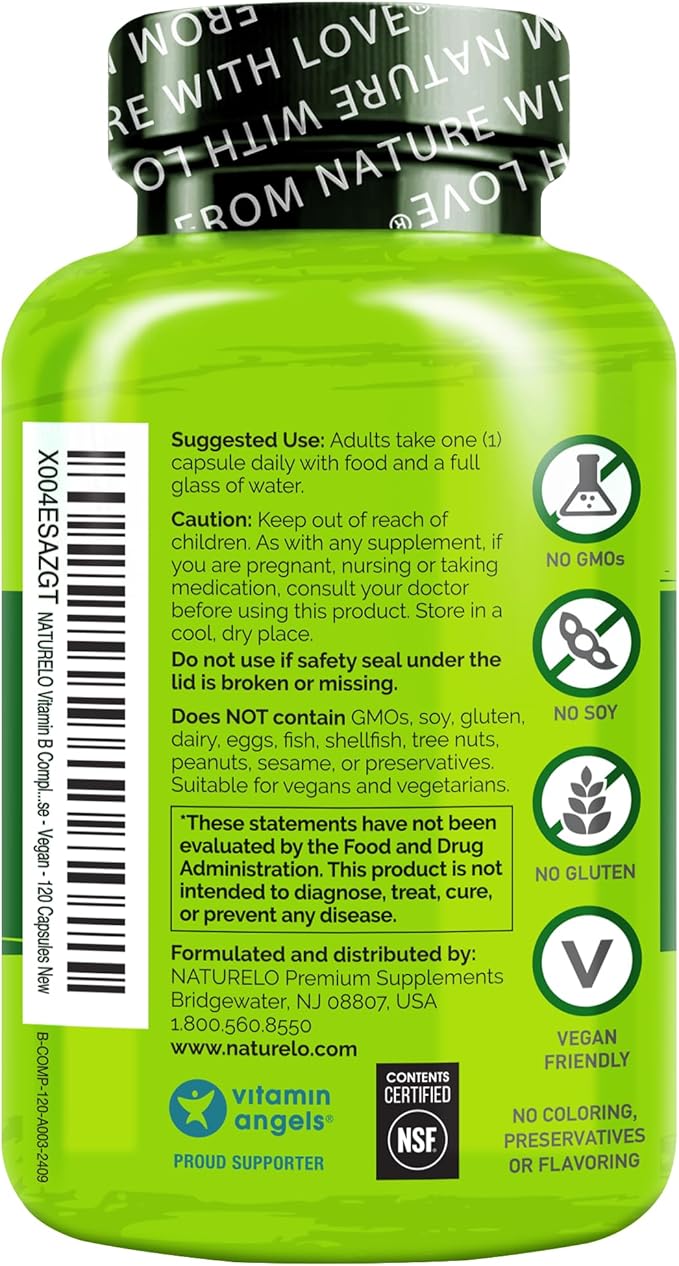 NATURELO Vitamin B Complex with Methyl B12, Methyl Folate, Vitamin B6, Biotin Plus Choline, CoQ10, and Fruit & Vegetable Blend - Supports Energy & Healthy Stress Response - Vegan - 120 Capsules