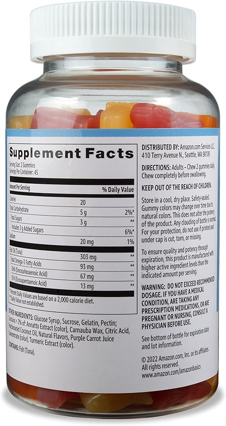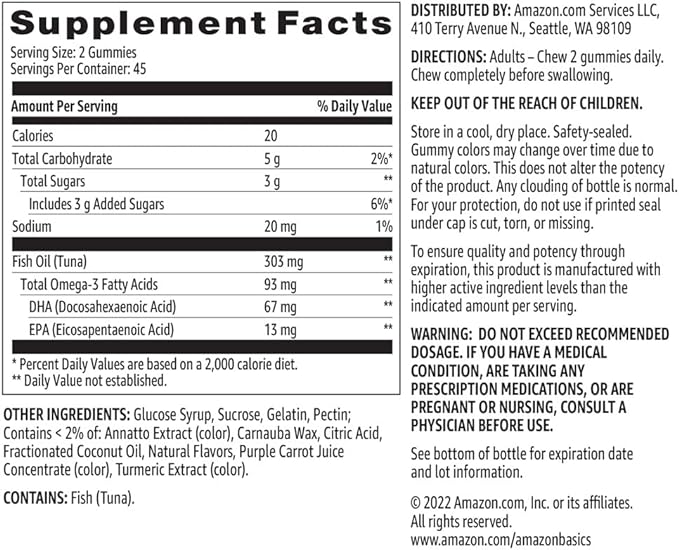 Amazon Basics Fish Oil 303 mg, Lemon, Orange & Strawberry-Banana flavors, 90 Gummies (2 per Serving), EPA and DHA Omega-3 fatty acids (Previously Solimo)