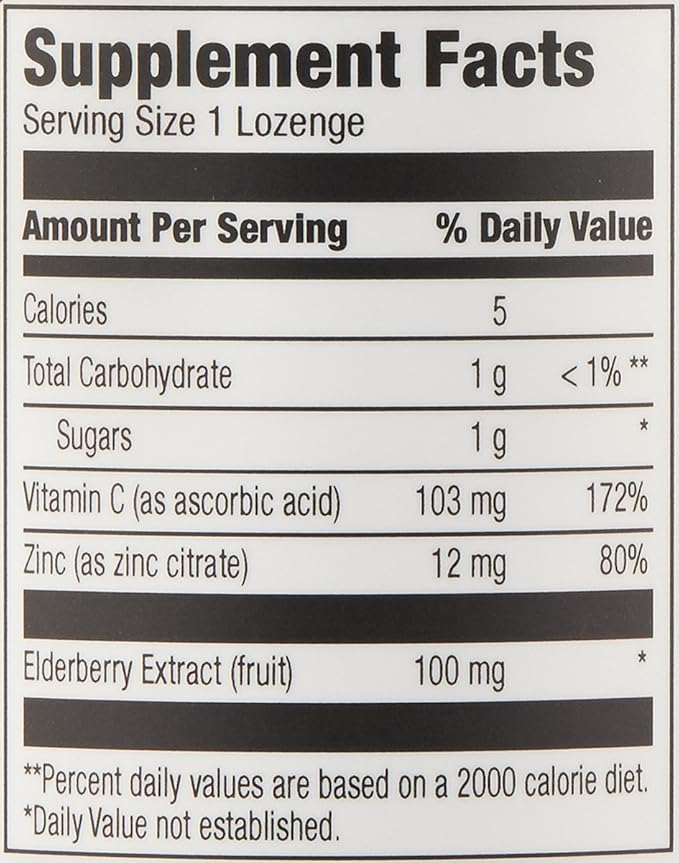 - ONE BOTTLE CONTAINS: 60 lozenges; 100 mg Elderberry, 103 mg Vitamin C, 12 mg Zinc per serving (1 lozenge)